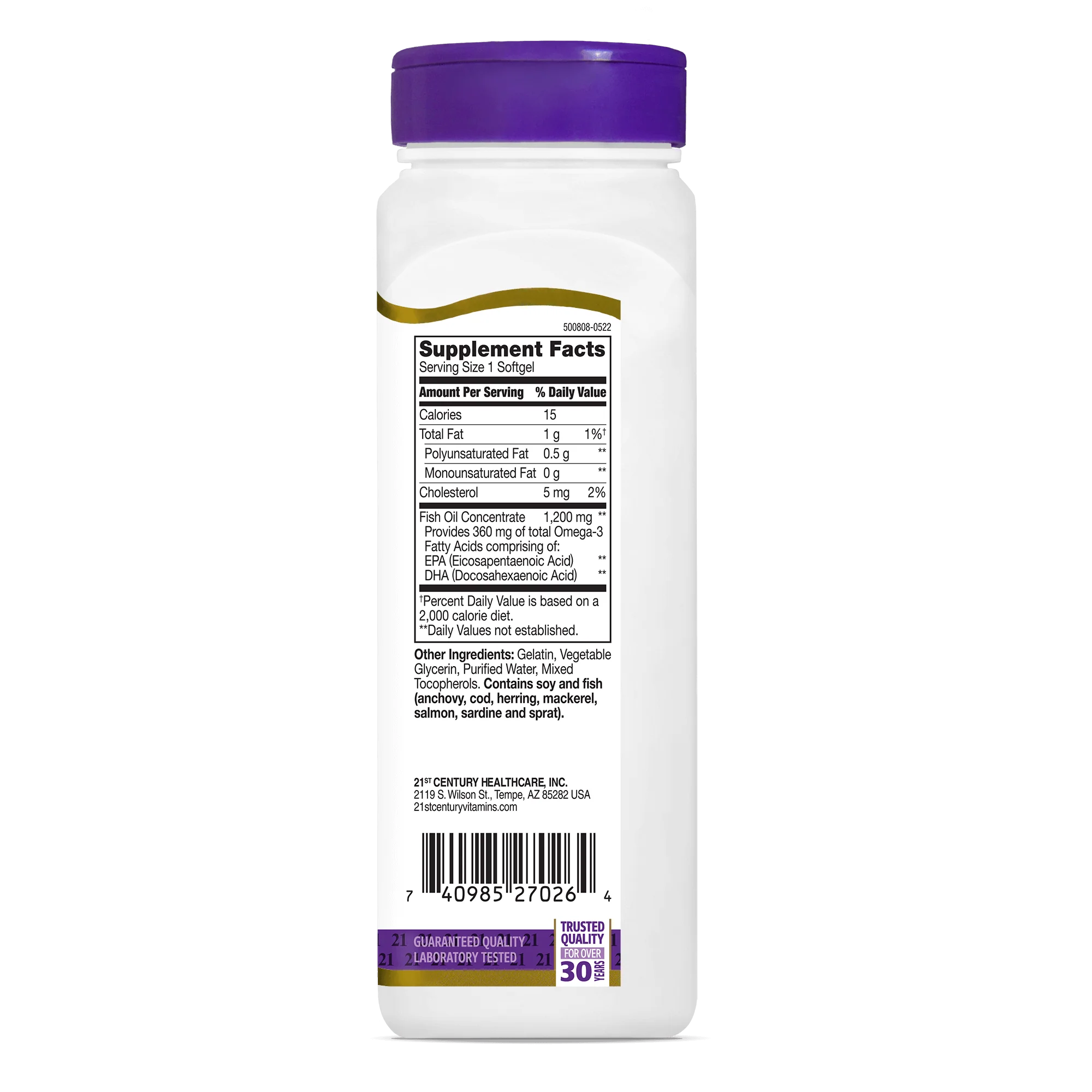 21ST Century® Fish Oil provides a good source of EPA and DHA Omega-3 fatty acids with each serving. These Omega-3 fatty acids play a significant role in supporting cardiovascular health as well as being important components of the cells in the body and contributing to overall well-being.* This fish oil concentrate is molecularly distilled and purified to eliminate mercury to ensure the highest quality and purity.