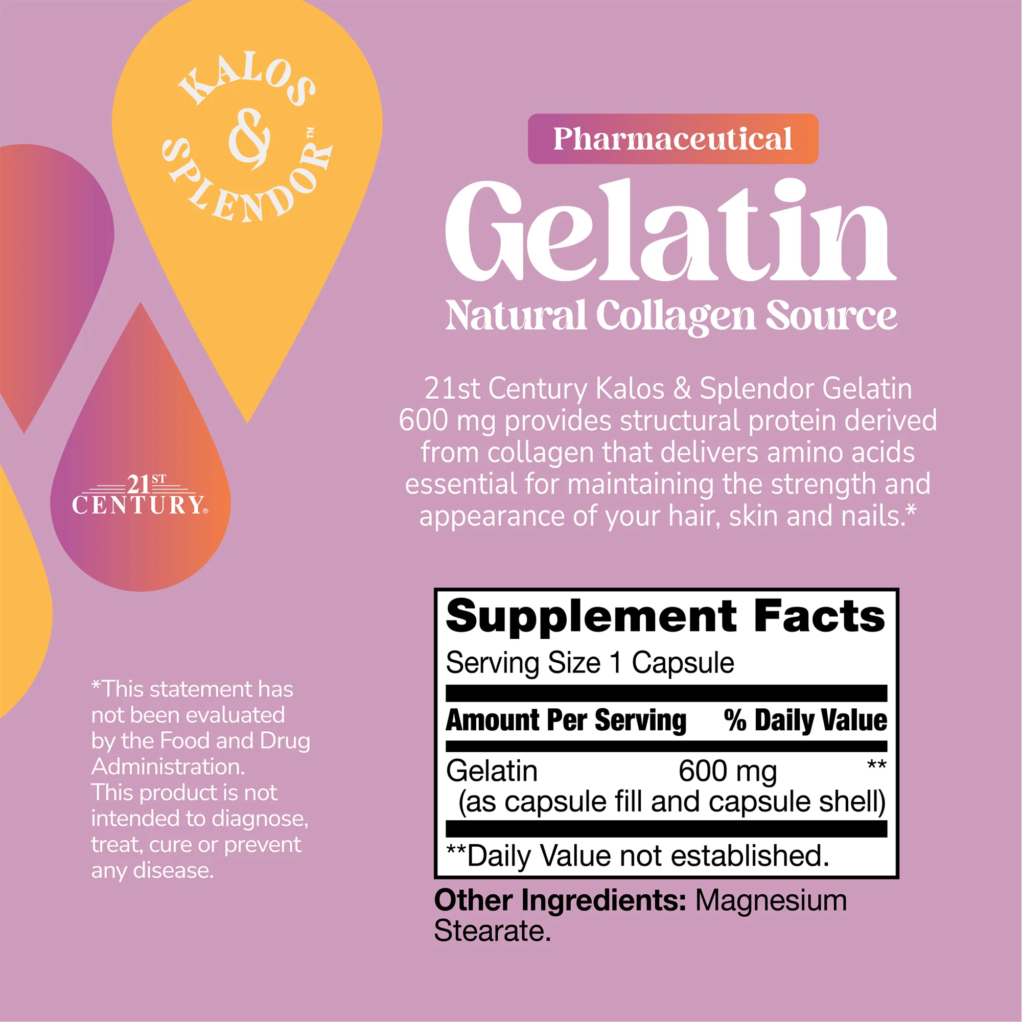 21st Century Kalos & Splendor Gelatin 600 mg provides structural protein derived from collagen that delivers amino acids essential for maintaining the strength and appearance of your hair, skin and nails.*