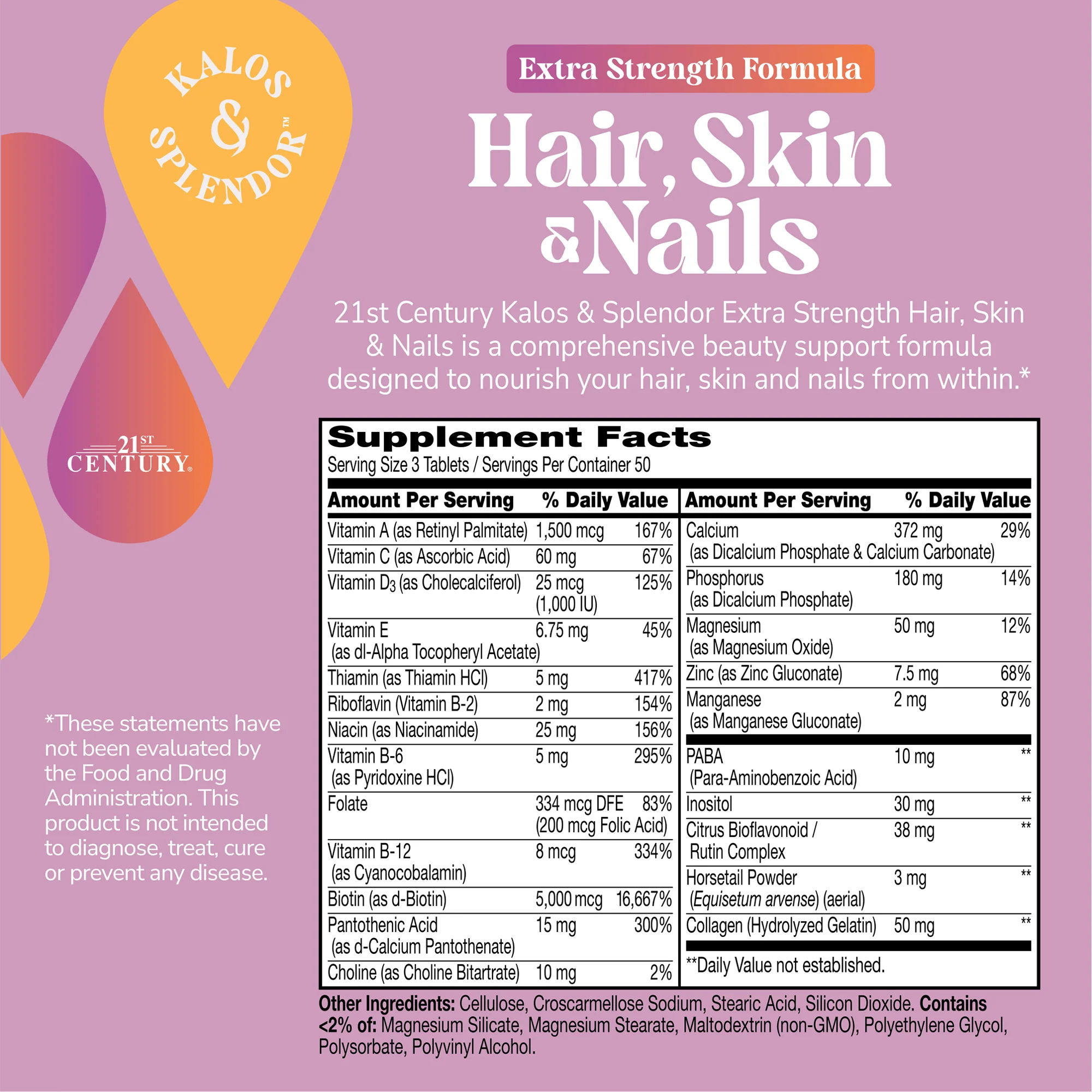 21st Century Kalos & Splendor Hair, Skin and Nails Extra Strength is a comprehensive beauty supplement and beauty vitamin. It is designed to nourish your hair, skin and nails from within.*