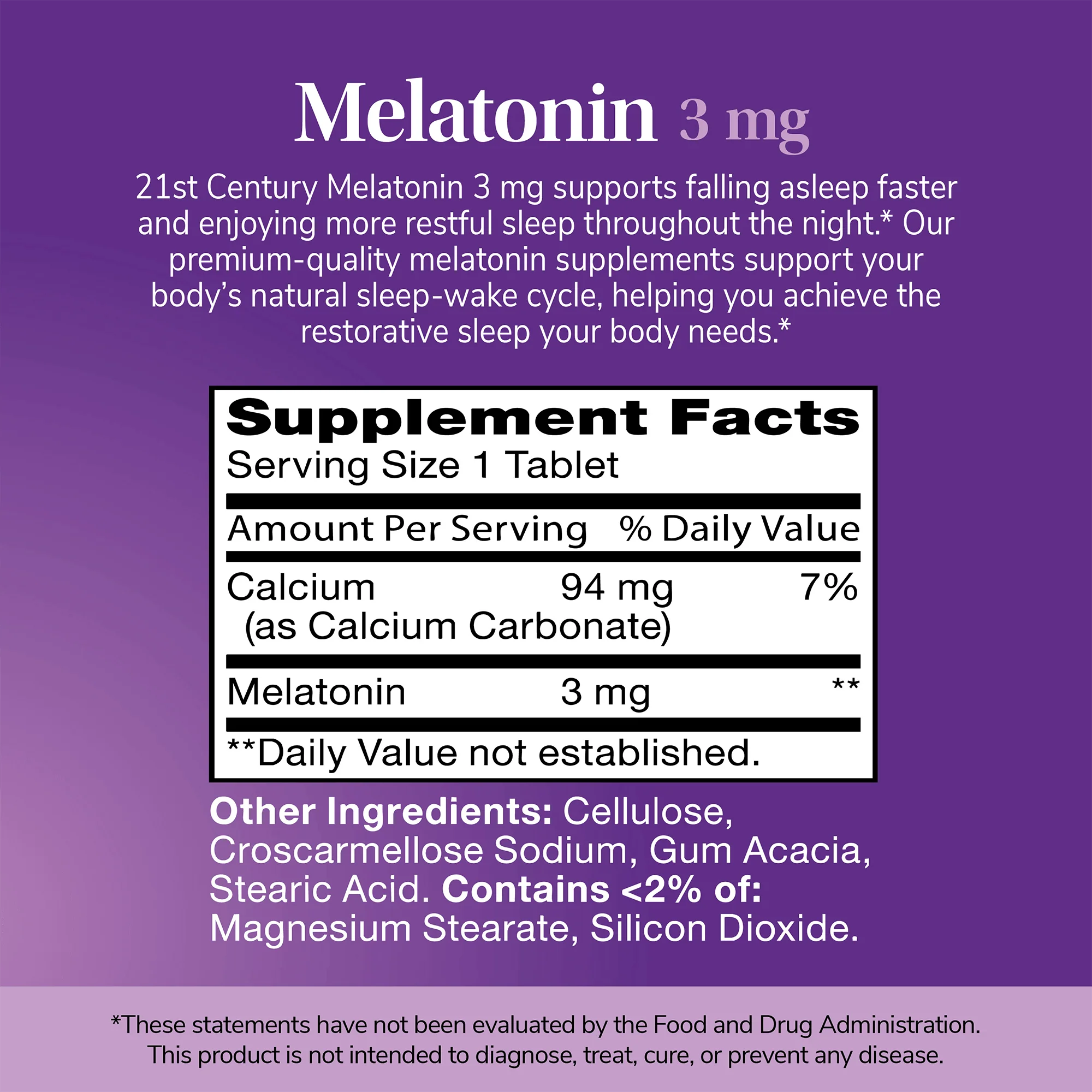 21ST Century Melatonin 3 mg supports falling asleep faster and enjoying more restful sleep throughout the night. Our premium-quality melatonin supplements support your body's natural sleep-wake cycle, helping you achieve the restorative sleep your body need.