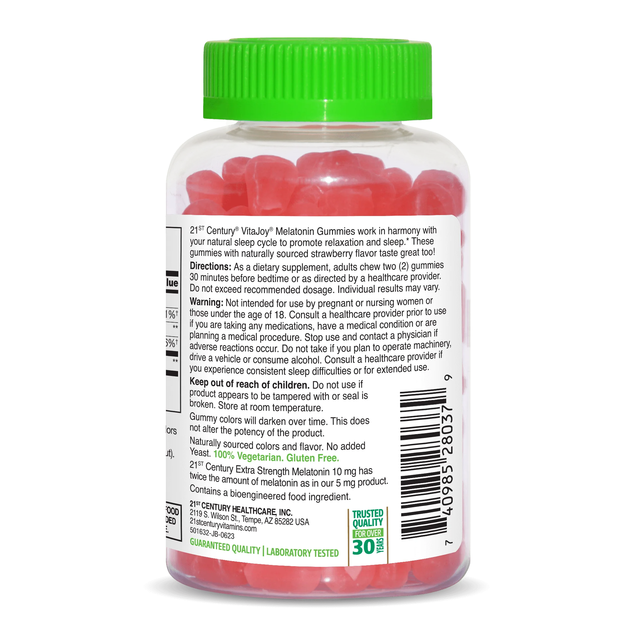 Melatonin is a natural hormone that regulates our circadian rhythm, helping to maintain our sleep/wake cycles. It plays a crucial role in promoting restful sleep and overall well-being.* 21stĀ Century VitaJoy Melatonin Gummies are delicious, strawberry-flavored gummies formulated with naturally sourced colors and flavors and provide a convenient way to support individuals with occasional sleeplessness to fall asleep faster and enjoy more restful sleep.*