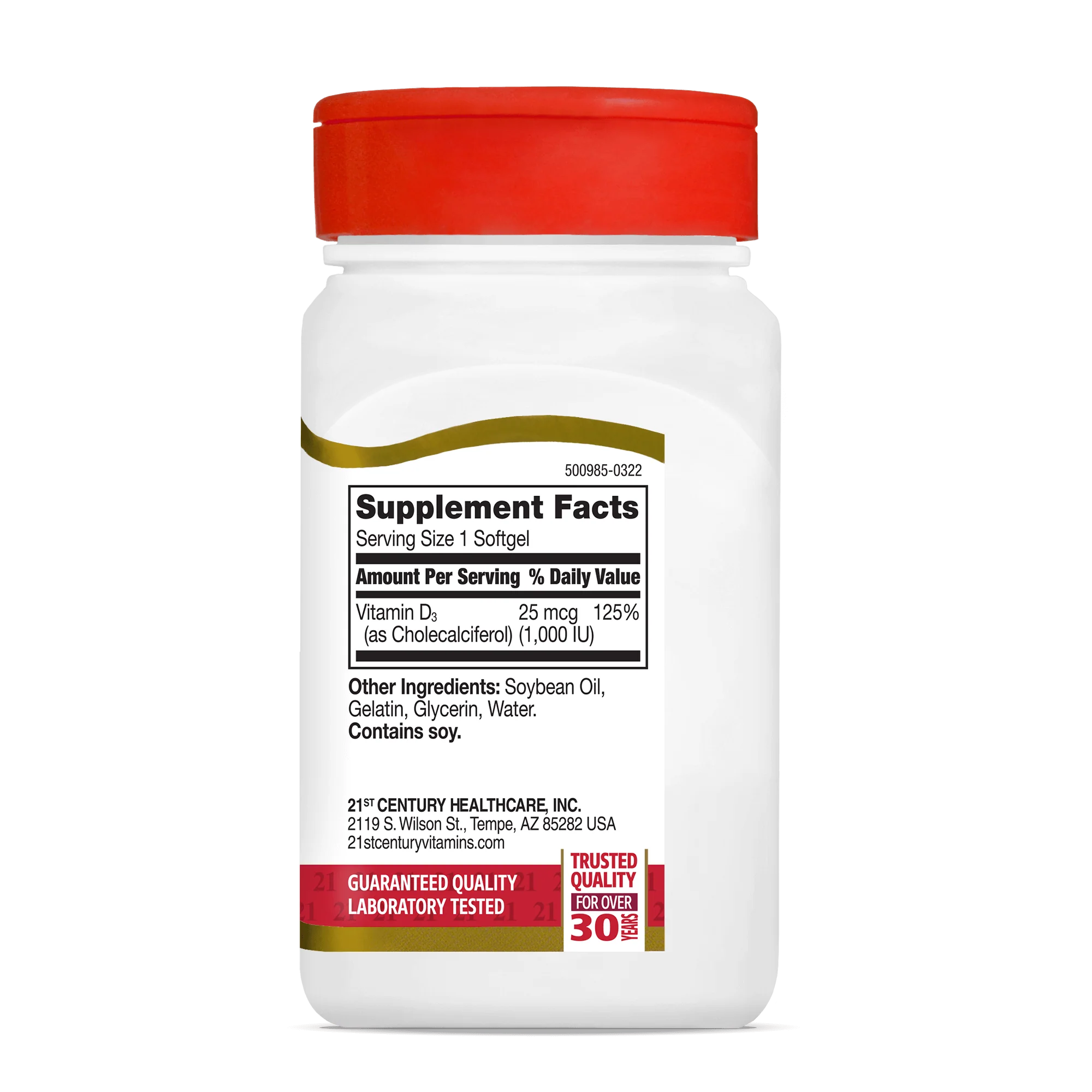 21st Century Vitamin D3 25 mcg Rapid Release softgels offer a convenient way to support your intake of this essential vitamin, which is naturally produced by your body when exposed to sunlight and found in limited food sources such as fatty fish and egg yolks.*